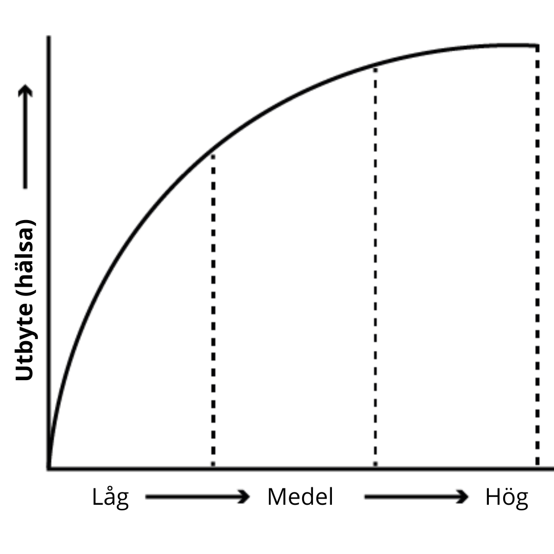 Det är mycket mindre än du tror, och just därför bör du ta dig tid att titta närmare på det som inom forskningen kallas för "dosis-responskurvan". Du behöver inte tvinga dig igenom 60 minuter av aktivitet för att det ska ge positiva hälsoeffekter. Personer med låg aktivitetsnivå har mycket att vinna på att öka aktivitetsnivån med motsvarande mängd. De största hälsofördelarna uppnås med andra ord bland dem som är i sämst fysisk form.